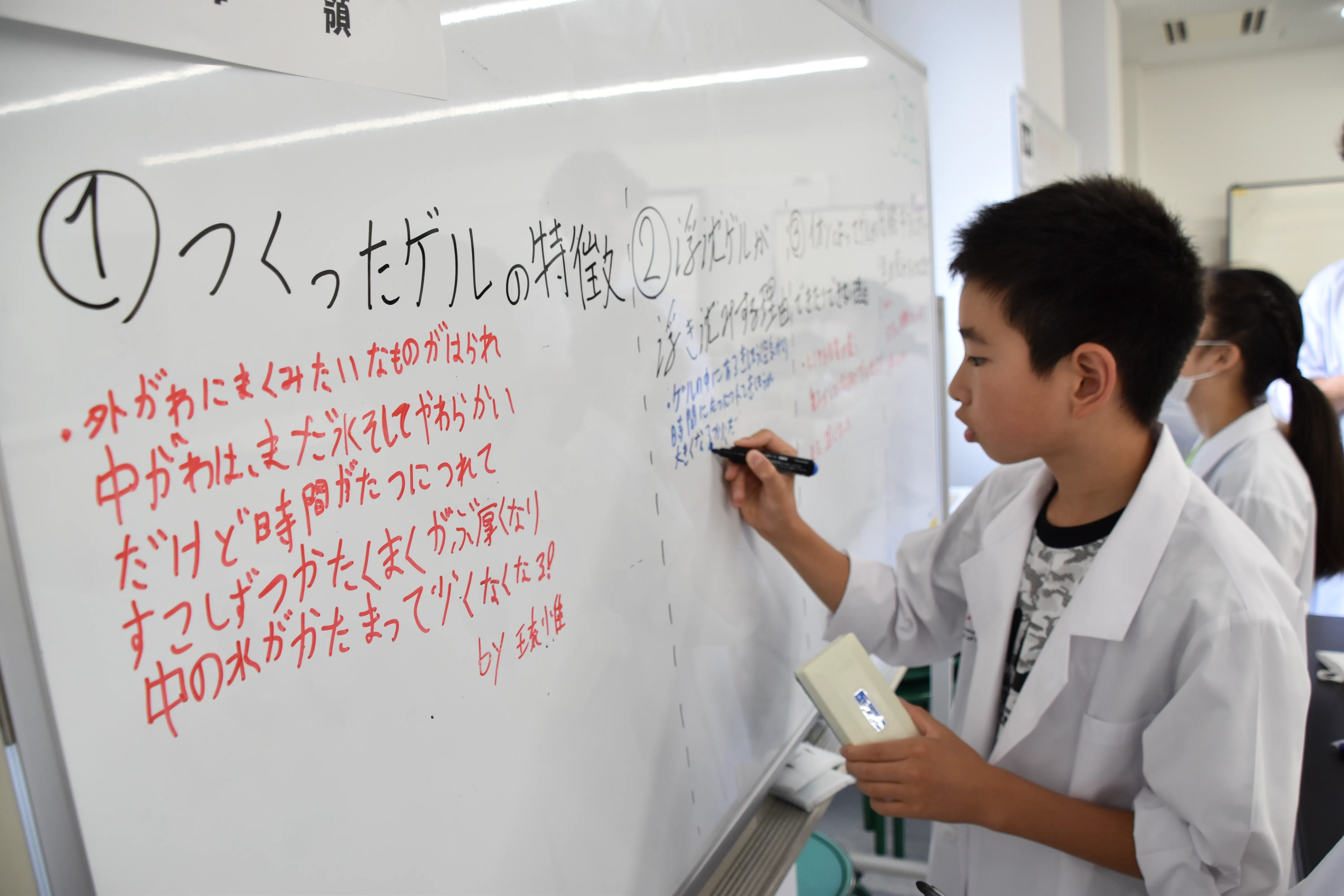 参加者の皆さんは、化合物を混ぜ合わせる実験の中でゲルができる場合とできない場合を分析することに挑戦しました。ゲルの仕組みや、化学反応により色が変わる不思議について考察しながら、化学反応の法則性やゲルの可能性について、学びを深めることができたのではないでしょうか。