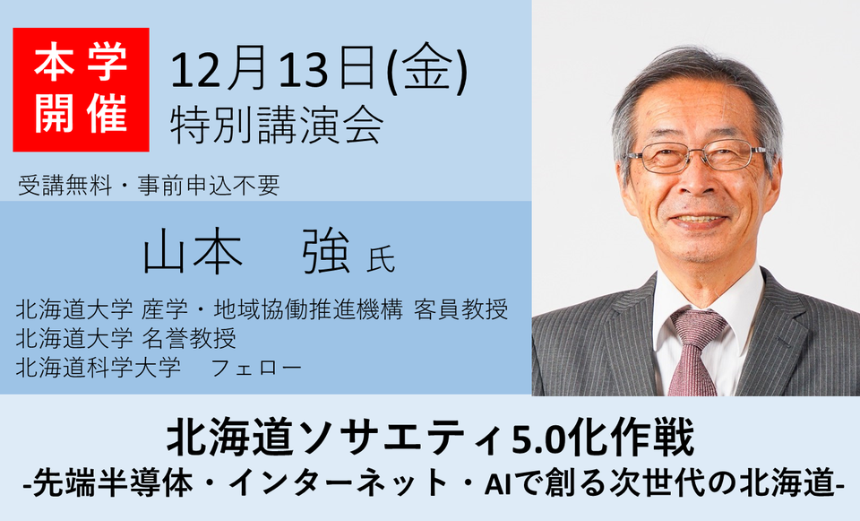 本学のフェローでもある山本強氏をお招きし、「北海道ソサエティ5.0化作戦 -先端半導体・インターネット・AIで創る次世代の北海道-」をテーマに特別講演会を開催します。