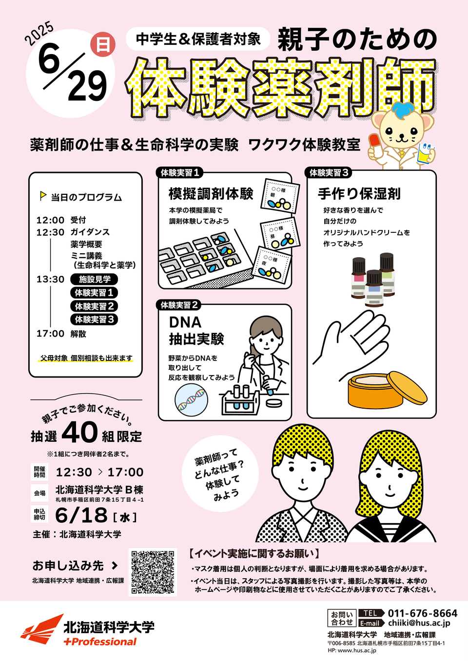 2025年6月29日(日)に本学にて、中学生&保護者対象「親子のための体験薬剤師 薬剤師の仕事&生命科学の実験 ワクワク体験教室」を開催します。