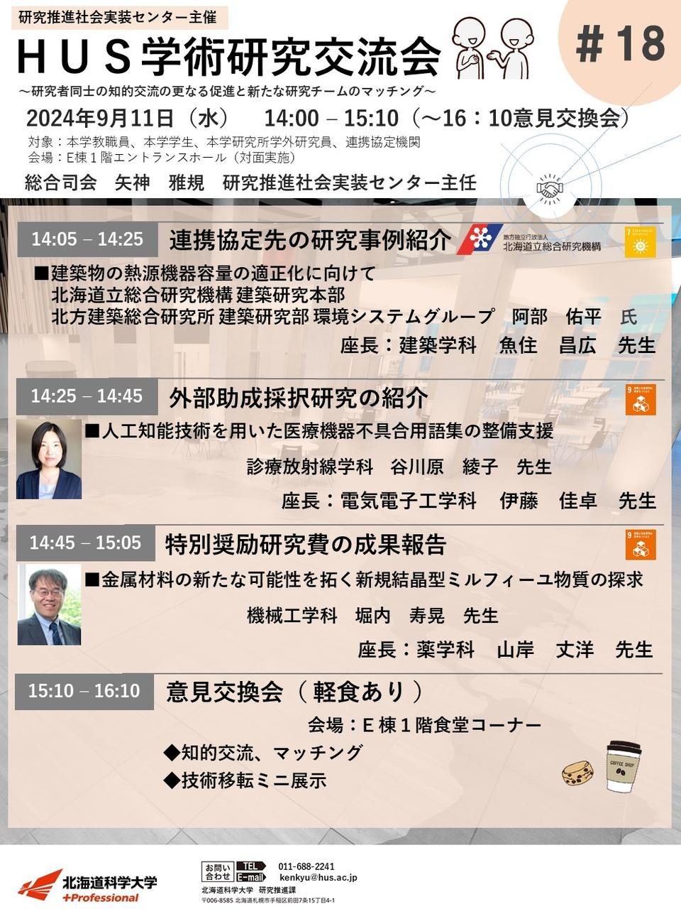 HUS学術研究交流会は、研究者同士の交流の場として開催4年目となり、学内の共同研究への繋がりも生まれています。今回も、さまざまな領域の研究成果を共有し、幅広い分野の方々と演者との間で有意義な質疑応答が展開され