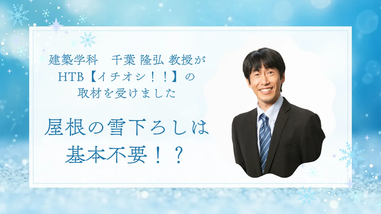工学部メディア掲載ニュース2026年02月06日建築学科の千葉 隆弘 教授がHTB【イチオシ!!】の取材を受けました【屋根の雪下ろしは基本不要!?】2026年1月30日放送の「イチオシ!!」で、【屋根の雪下ろし】に対する建築学科の千葉 隆弘 教授のコメントが放送されました。興味を持ったら・・・千葉 隆弘 先生建築学科ほくかだい辞典 (千葉先生監修記事)この記事をSNSでシェアXでシェアするLINEでシェアする