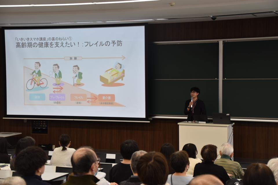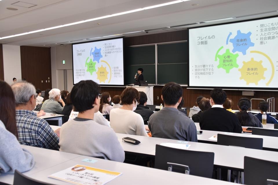 講義では、加齢に伴う心身の衰えである「フレイル」について解説があり、身体的な側面だけでなく、社会的・心理的な側面も含めて予防していくことの重要性が紹介されました。
