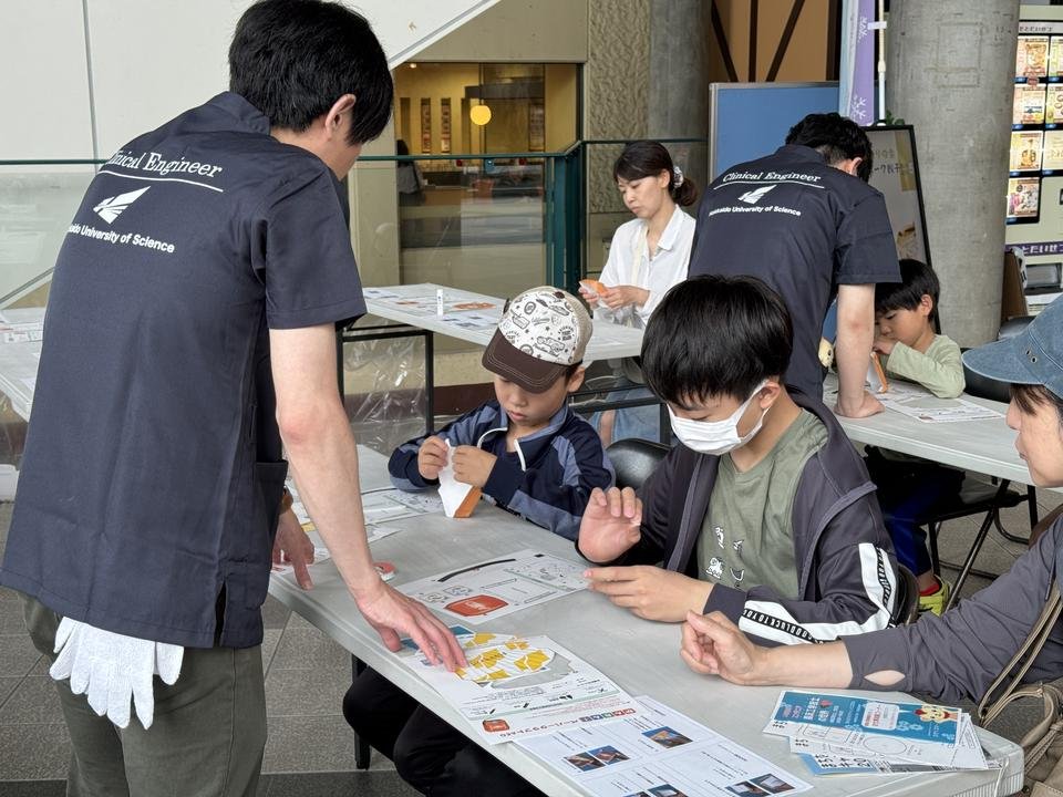 医療機器の専門職「臨床工学技士」の仕事を体験してみよう!電気メスや除細動器などの機器に触れながら、命を支える仕事を学びます。AEDペーパークラフト作りを通して、いざというときに大切な人の命を守るための知識を楽しく身につけます。