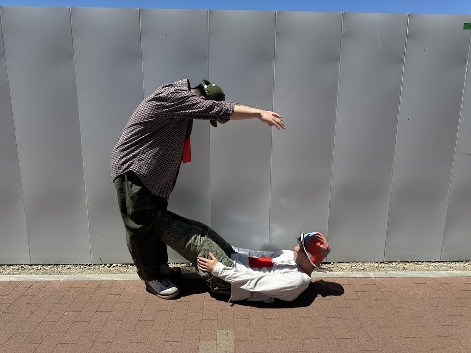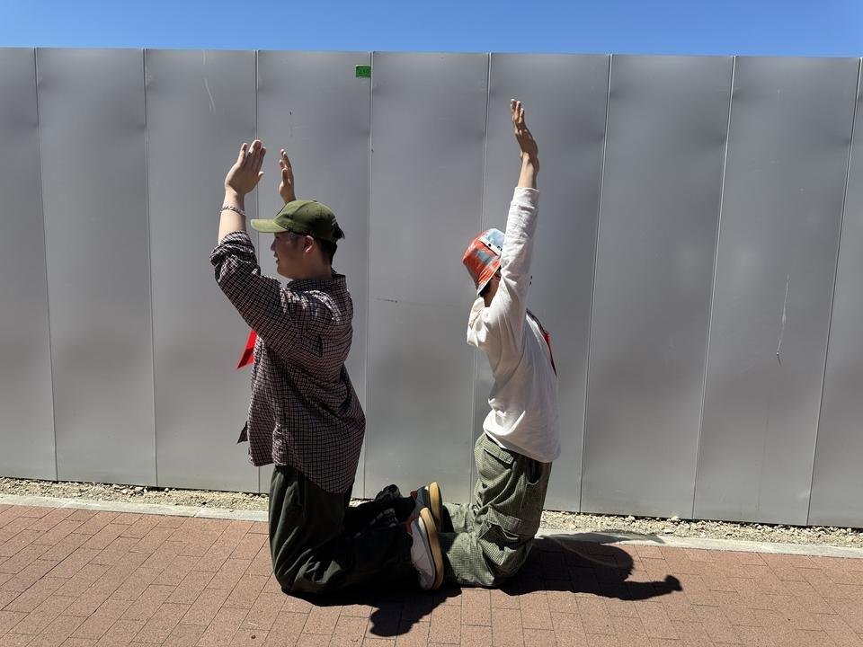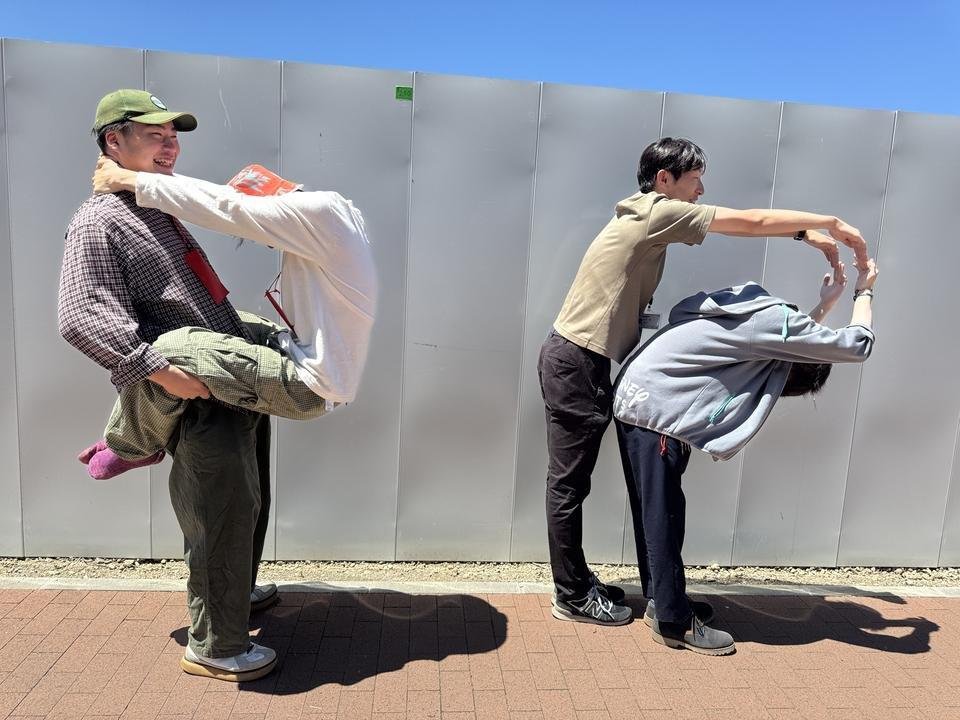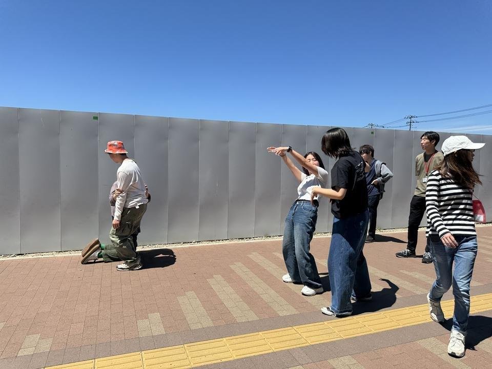 今回の現地ワークでは、「CAMPUS」の6文字を学生たちが2人1組で人文字として表現する体験も行いました。仮囲いの前に立ち、一文字ずつポーズを工夫しながら撮影を実施。写真や動画でその様子を記録しました。