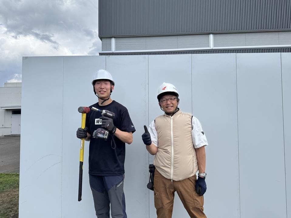 パネル設置作業を担当したのは、都市環境学科の細川和彦准教授と人間社会学科4年の杉田真さん。炎天下の中、タンカンやインパクトドライバーを使いながら、1枚ずつ丁寧に仮囲いを組み立てていきました。