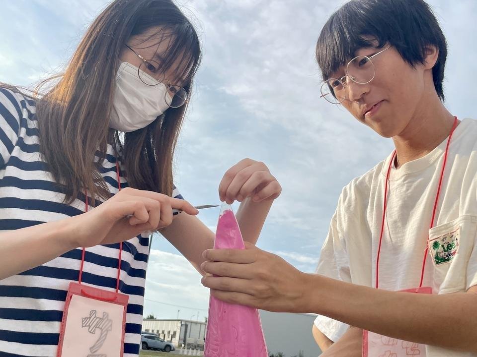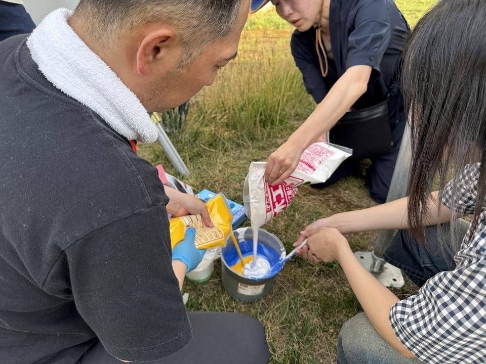 この日のために、メディアデザイン学科の髙木義隆先生とゼミ生が中心となり、複数のボンドや絵具の相性、発色、混ぜ方などを事前に検証。ボンドを塗るための絞り袋には製菓用の道具を使用し、混ぜる際にはゴムベラを使うなど、身近な道具を使うなど工夫を凝らした準備が行われてきました。