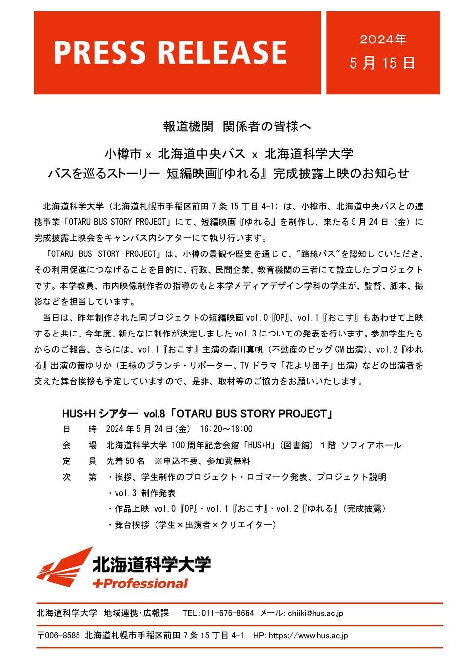 北海道科学大学(北海道札幌市手稲区前田7条15丁目4-1)は、小樽市、北海道中央バスとの連携事業「OTARU BUS STORY PROJECT」にて、短編映画『ゆれる』を制作し、来たる5月24日(金)に完成披露上映会をキャンパス内シアターにて執り行います。