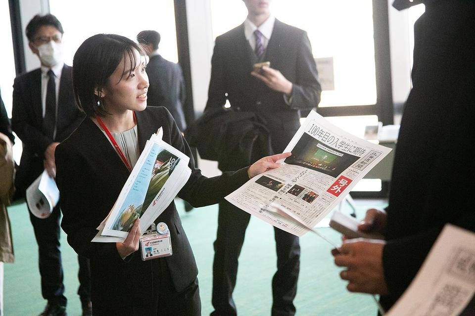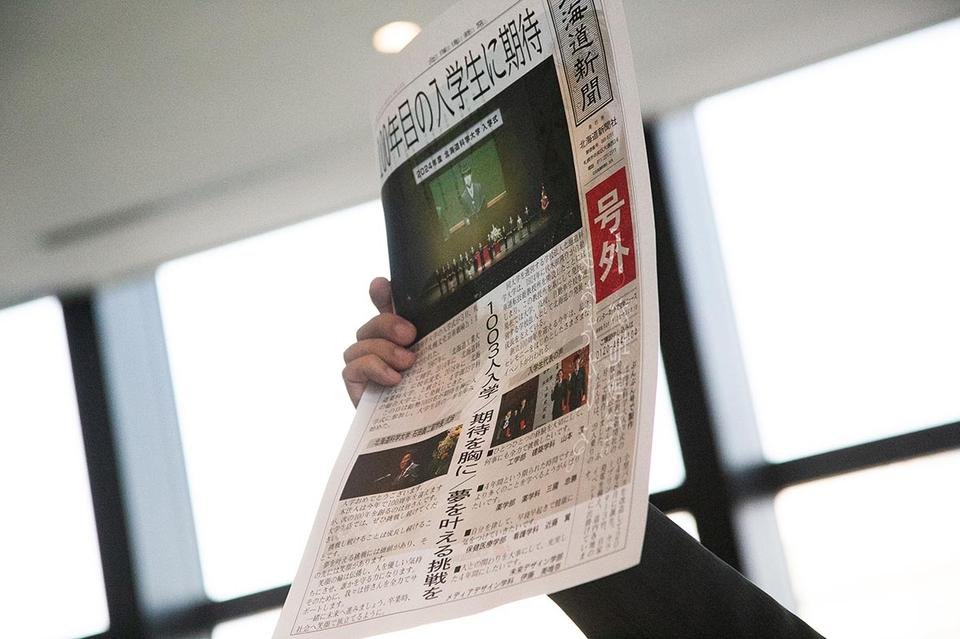 また、2024年度は法人創立100周年の節目となることから、入学式を挙行している中、北海道新聞社の取材・宣伝車「ぶんぶん号(※)」で「北海道科学大学 号外」を製作し、入学式終了後に入学生・保護者に配布しました。