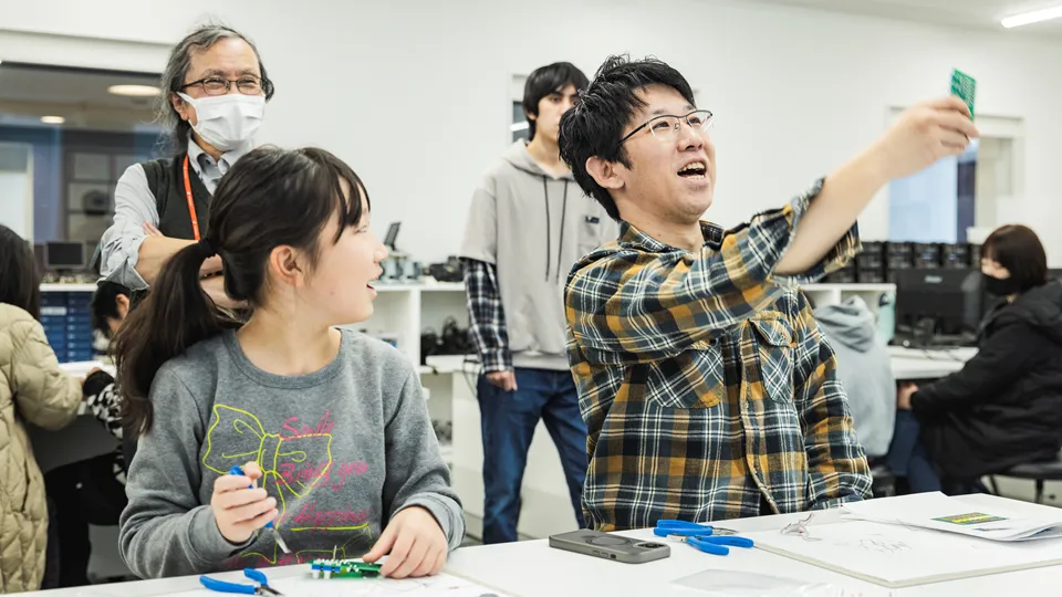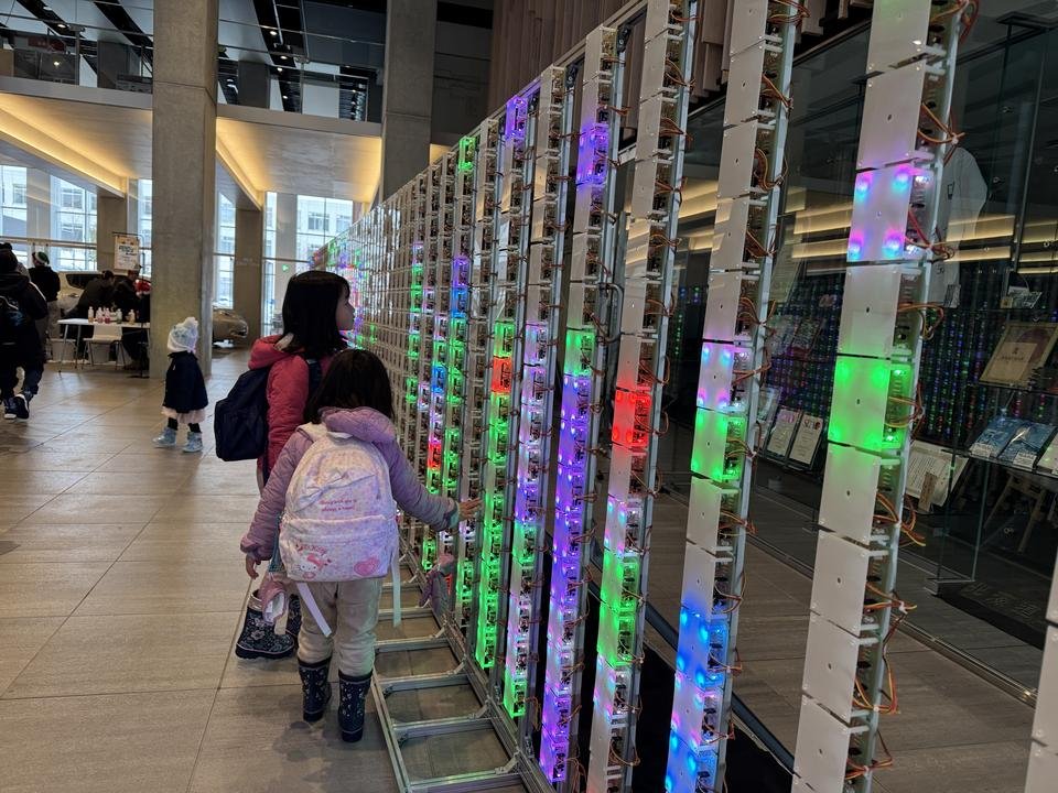 Installation Artとは、人感センサーやフルカラーLED、マイクロコンピュータなどを組み合わせて構成された作品で、これまで本学の学生・教職員に加え、多くの地域の方々にも電子基盤の制作にご協力いただいています。