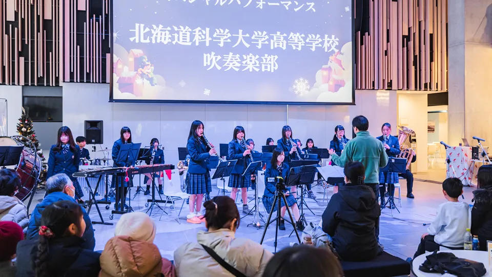本学の各学科・団体が主催する複数のワークショップブースを自由に巡って体験できるほか、E棟1階ホールでは学生団体や北海道科学大学高等学校吹奏楽部によるパフォーマンスを実施しました。屋外にはキッチンカーも並び、盛りだくさんの内容となりました。