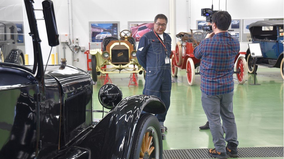 本学のT型フォードを含むクラシックカーの復元について、整備を担当している機械工学科の北川浩史准教授や学校関係者に対して、車両の説明やエンジンをかけて走行する様子について取材が行われました。