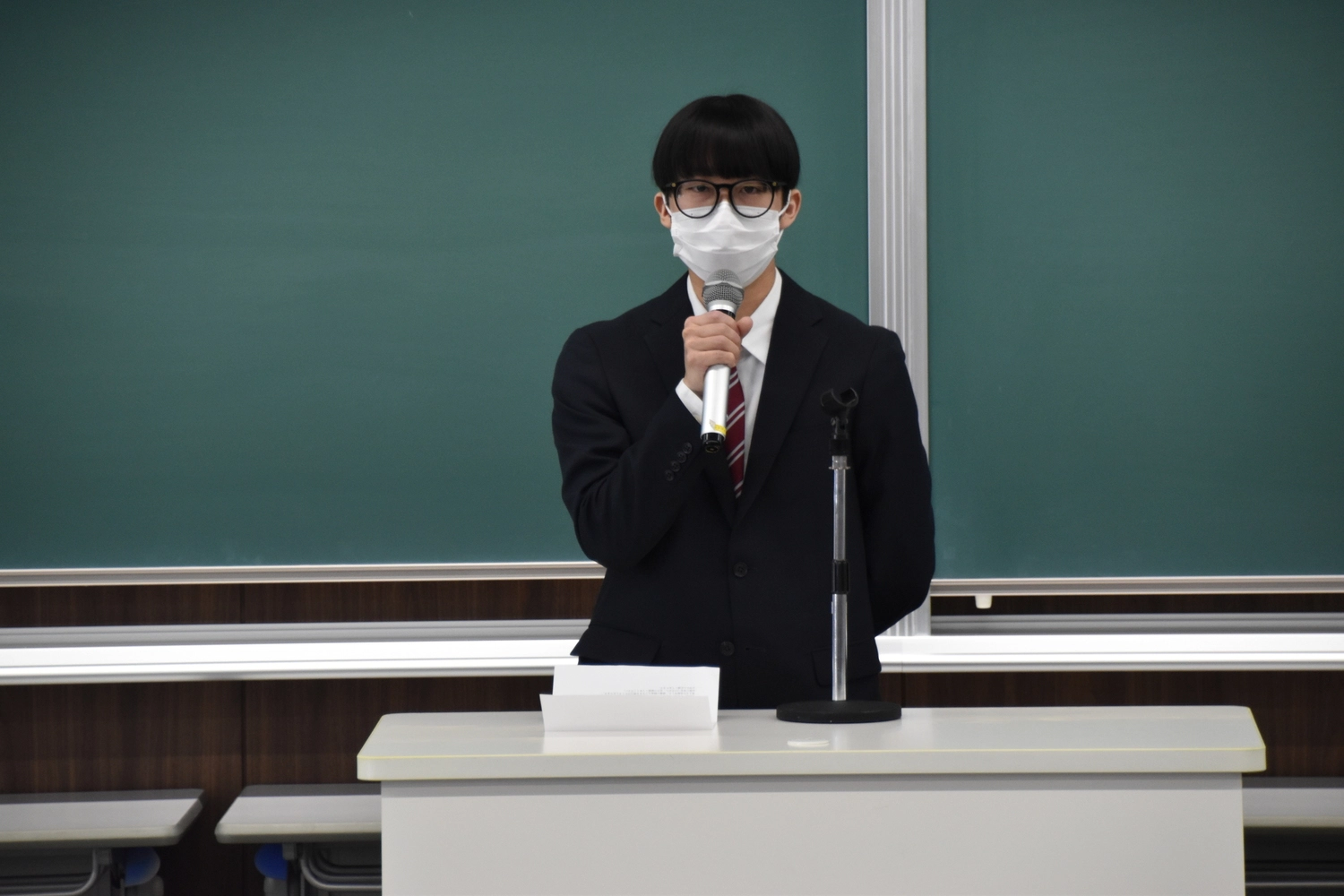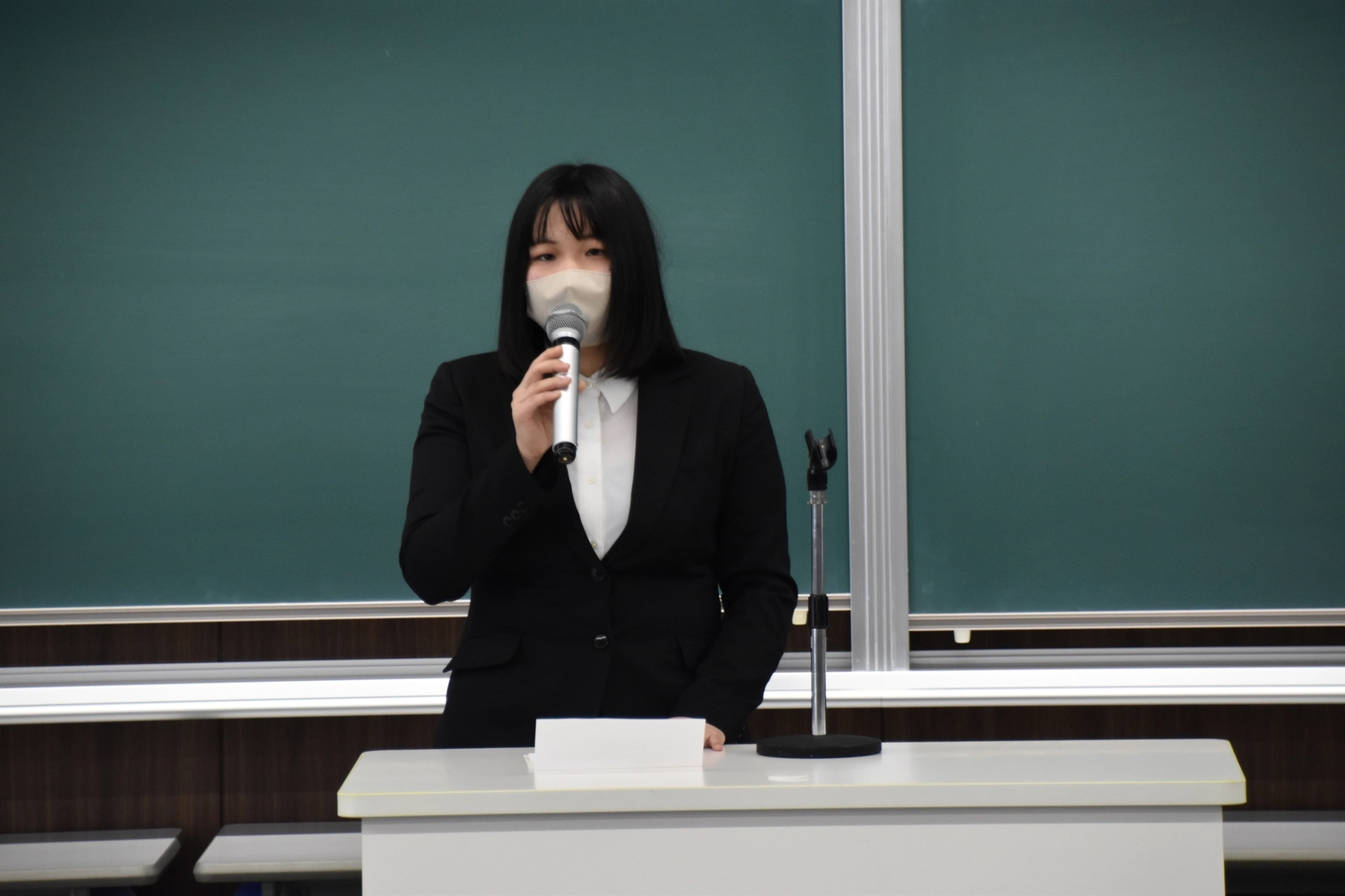 来賓からの祝辞を頂いたあとは、本学薬学部5年生2名から激励のメッセージがありました。