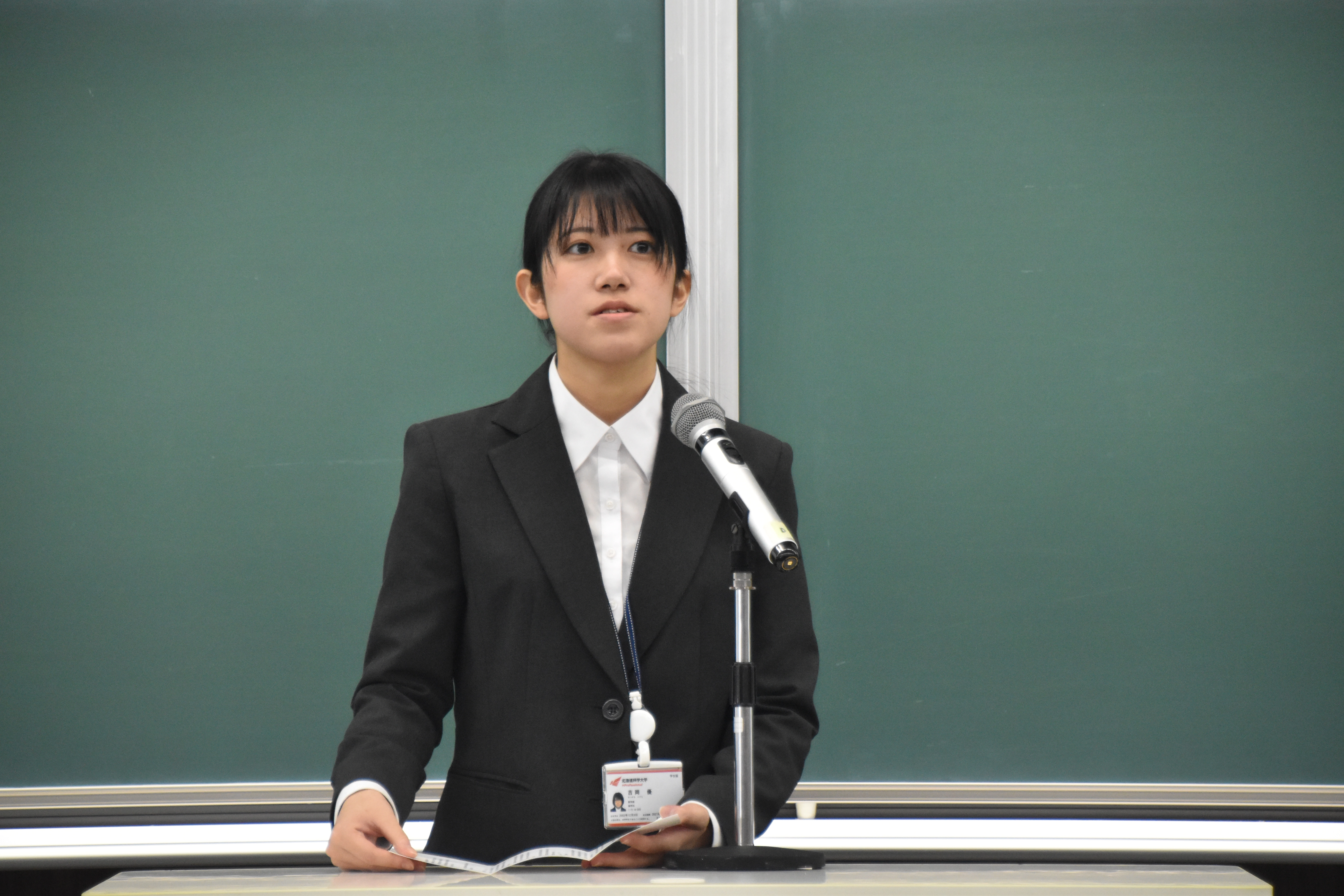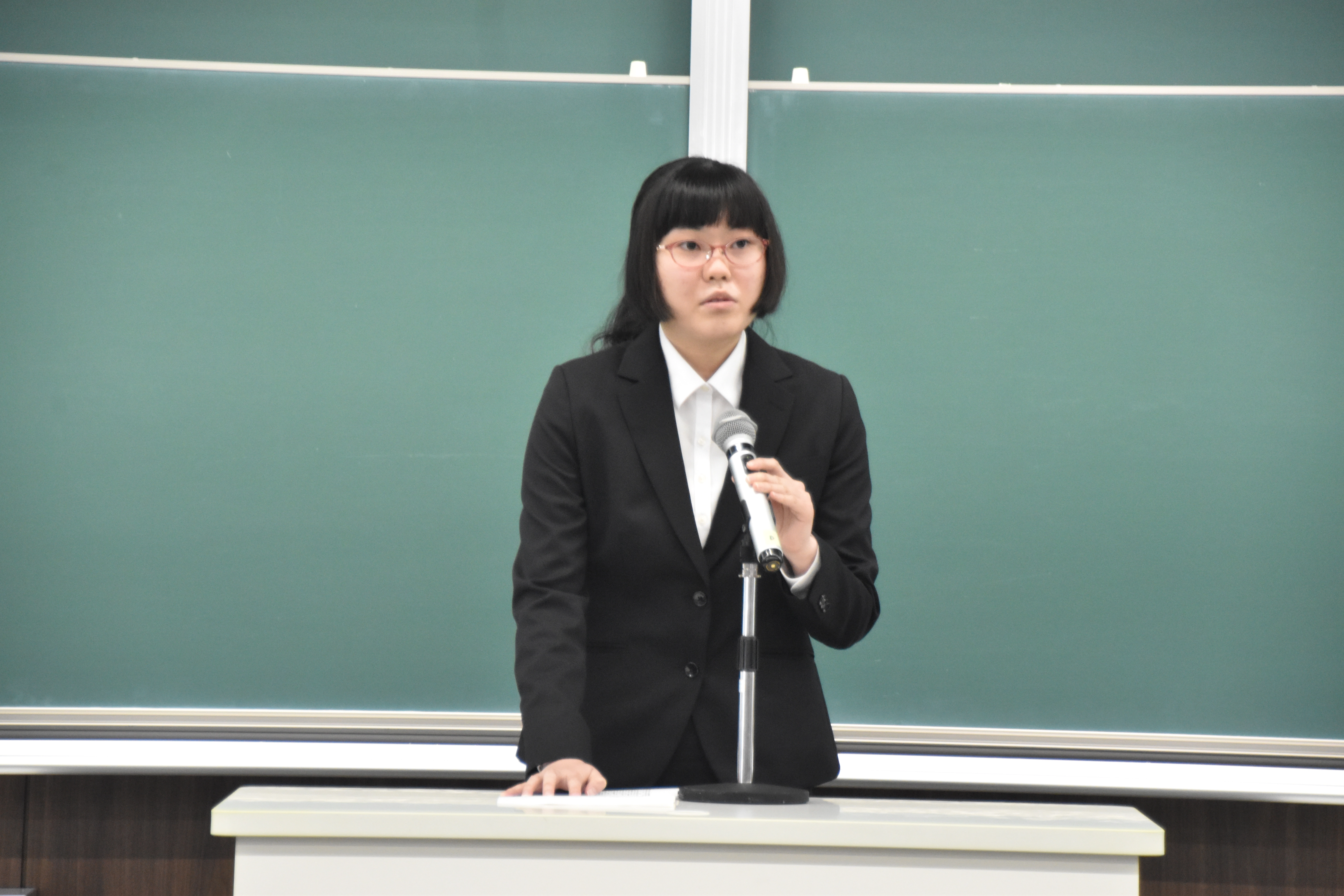 来賓からの祝辞を頂いたあとは、本学薬学部5年生2名から激励のメッセージがありました。