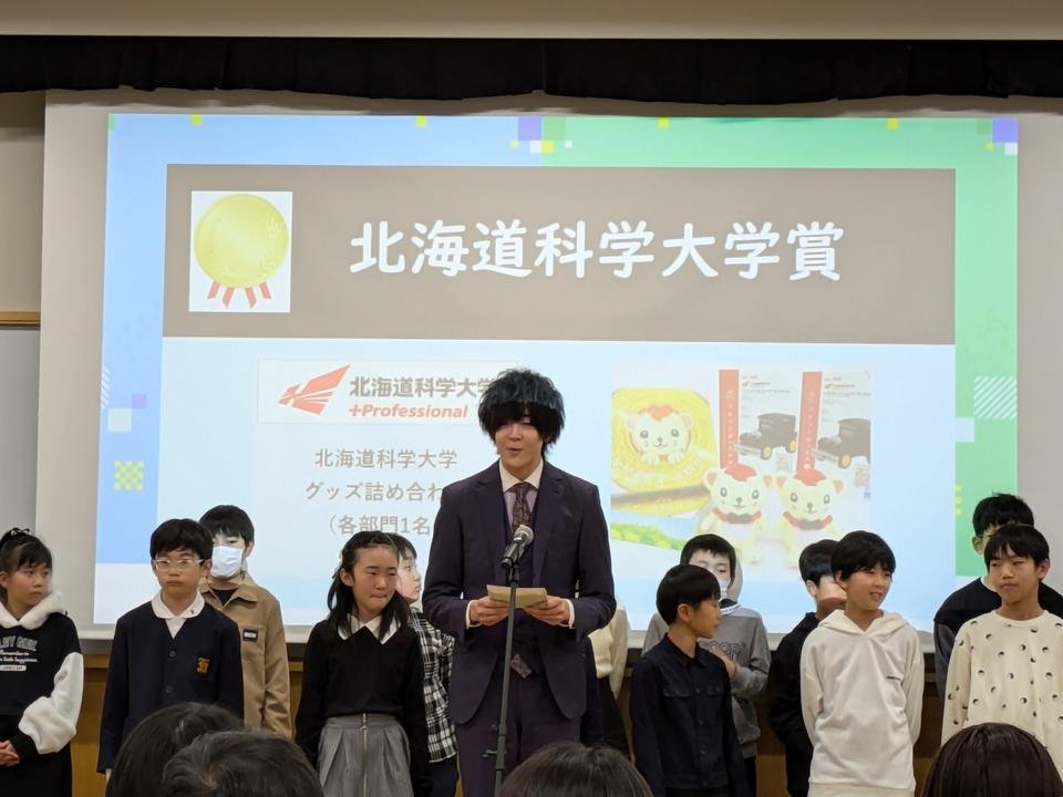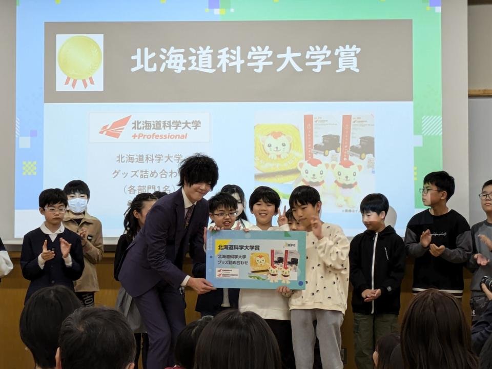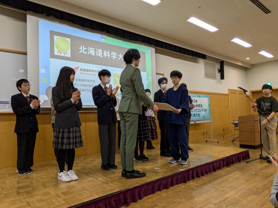 コンテストでは、特別賞として「北海道科学大学賞」の審査が行われ、情報工学科の荒澤 孔明助教と電気電子工学科4年 見砂 七海さん、金子 尚平さん、メディアデザイン学科4年 平間 海人さんが審査員を務めました。特別賞では、発想力の優れた作品、表現力の優れた作品、技術力に優れた作品をなどを選出し賞状を副賞の授与が行われました。