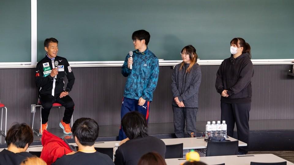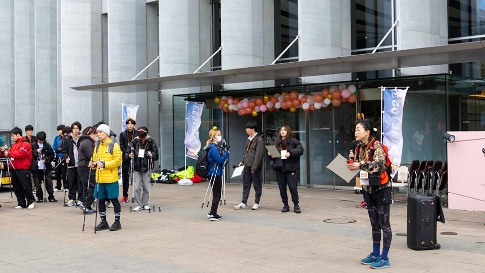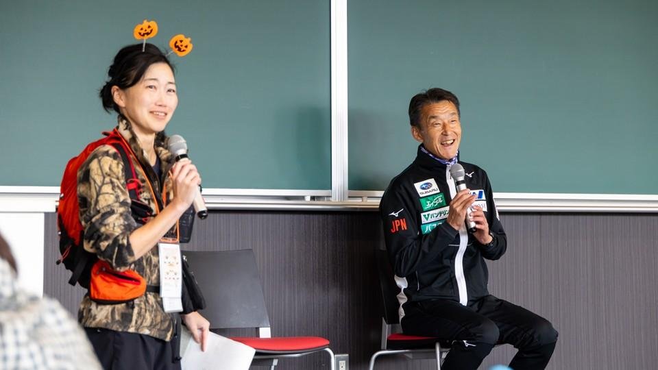 スタート前に開催された開会セレモニーでは、プロジェクトリーダーの道尾 淳子准教授からの挨拶に続き、1994年リレハンメルオリンピック ノルディック複合団体の金メダリスト阿部 雅司さんと、札幌オリンピックミュージアム学芸員 山谷 和正さんによるノルディックポールを使った歩き方講座と、ストレッチ講座を実施し、参加者全員で実践しました。