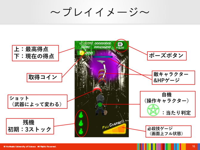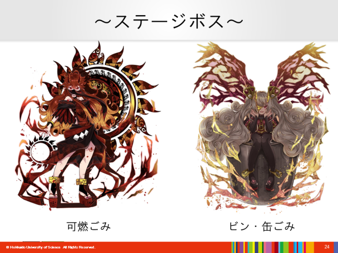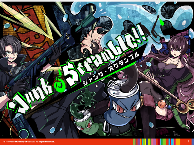 制作した「Junk Scramble(ジャンク スクランブル)」はゴミの分別の大切さやリサイクルへの意識を高めることを目的としたシューティングゲームです。陰陽師の家系が運営している清掃会社の社員である主人公は、廃棄物に憑依した物の怪を成敗していくというストーリーのゲームアプリです。