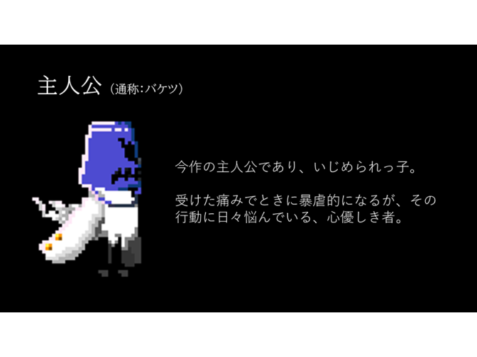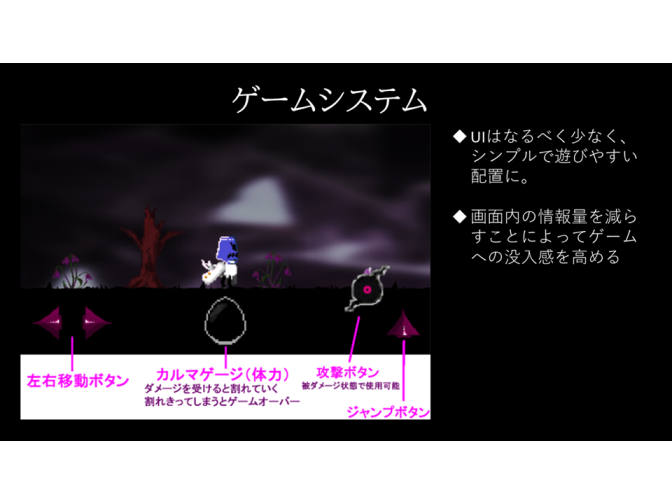 制作した「Bullying」は、「いじめ」について「考える」ことを目的としたアクションゲームです。暗く、不気味に荒廃した世界の中で、主人公が怪物「ジメイ」から逃げたり、倒したりしながら数多くの答えを求めて歩みを進めます。しかし、行動には責任が伴い、選んだ行動で結末(エンディング)が変化するゲームです。