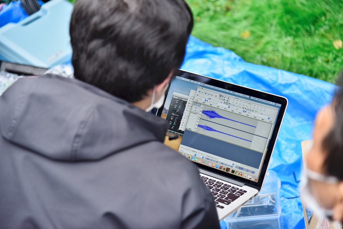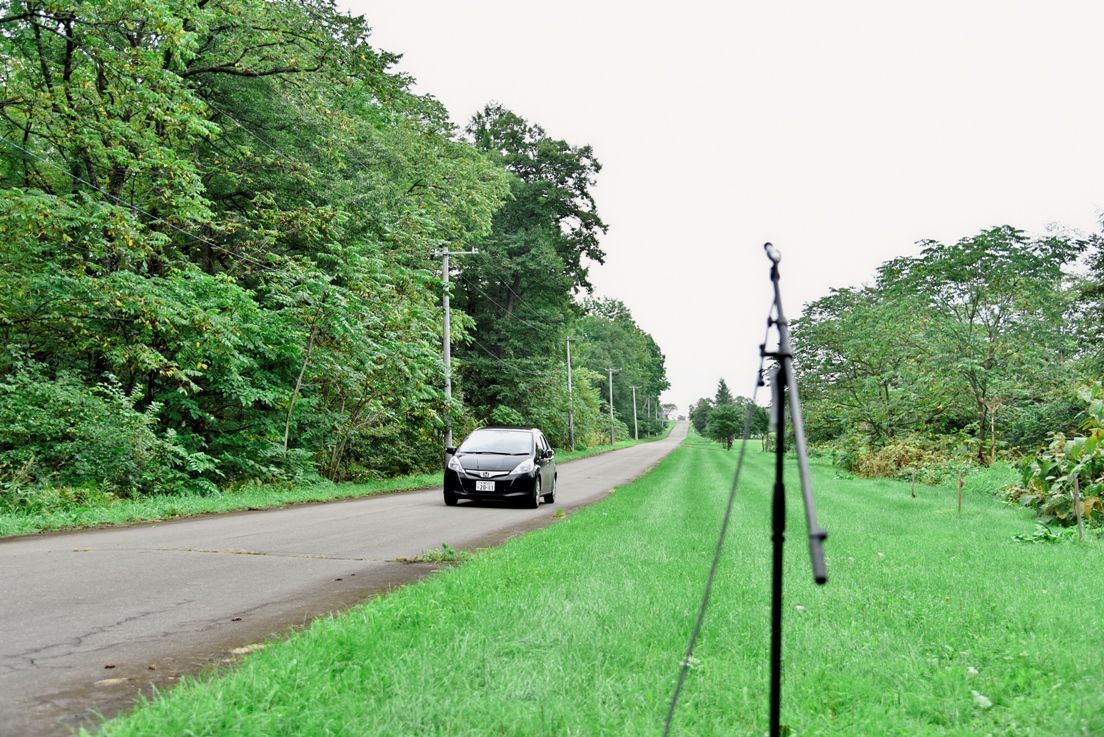 実験では400mほど離れた位置から、超指向性スピーカーを取り付けた車両を一定速度(60km/h)で走行させ、道路脇すぐと道路と垂直方向に10m程度離れた位置で収録しました。