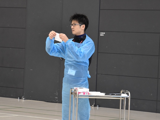 はじめに看護学科の石川幸司講師による感染防止用ガウンの着脱方法等について実演を交えながら解説があり、参加者全員が体験しました。