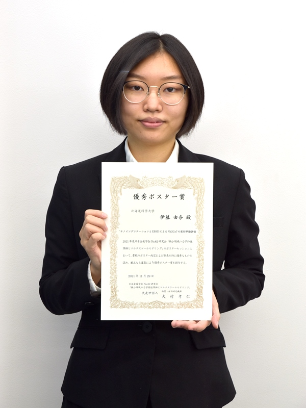 工学研究科機械工学専攻修士1年の伊藤由奈さんが、2021年10月~11月にオンライン開催された日本金属学会研究会「微小領域の力学特性評価とマルチスケールモデリング 2021」においてポスター賞を受賞しました。