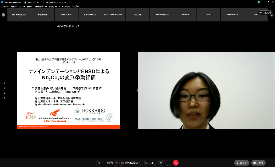 伊藤さんの発表題目は「ナノインデンテーションと EBSD による Nb2Co7 の変形挙動評価」で、新規結晶構造型ミルフィーユ材料として注目されている金属間化合物の変形機構解明に挑む研究です。
