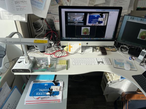 本学電気電子工学科の木村尚仁教授が講師となり実施したこの教室は、木村教授の研究室と猿払村の地域交流施設「楽楽心(ららはーと)」の大ホールをZOOMで繋ぎ、オンラインによるリアルタイムでコミュニケーションをとりながら、一緒に電気工作を行いました。