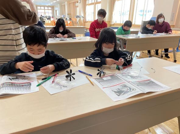 今年度は学童クラブの小学1年生1名、2年生3名、3年生3名、4年生1名の計8名の小学生が参加し、電気の仕組みやLEDについてなどを学びながら、「ミニミニ風力発電器」を作製しました。