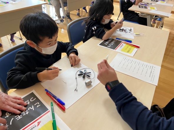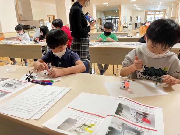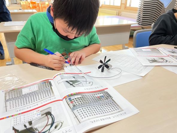 参加した子供たちは、初めて見る部品や細かな作業に苦戦しながらも、木村教授の画面越しの説明や先生方の力を借りて、ミニミニ風力発電器を完成させようとしていました。発電器完成後は、LEDランプを光らせようと一生懸命プロペラを回し、楽しんでいました。