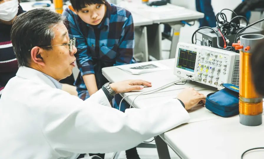 診療放射線技師にとって、物理の基礎知識は必要不可欠です。物理の知識を、座学だけでなく実験を通じて理解を深めることで応用力を身につけていきます。1年次で実施する医用物理学実験では、放射線計測に必要な物理の特性、特に電気物理の基本を理解し、専門課程の内容につなげていきます。電圧計や電流計の使用法や、オシロスコープ、回路の計測法、モンテカルロ法の基礎などについて実験を行います。